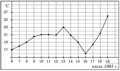 На рисунке жирными точками показана среднесуточная температура воздуха в Бресте каждый день с 6 по 19 июля 1981 года. По горизонтали указываются числа месяца, по вертикали — температура в градусах Цельсия. Для наглядности жирные точки соединены линией. Определите по рисунку разность между наибольшей и наименьшей среднесуточными температурами за указанный период. Ответ дайте в градусах Цельсия.