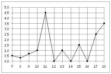 На рисунке жирными точками показано суточное количество осадков, выпадавших в Мурманске с 7 по 22 ноября 1995 года. По горизонтали указываются числа месяца, по вертикали — количество осадков, выпавших в соответствующий день, в миллиметрах. Для наглядности жирные точки на рисунке соединены линией. Определите по рисунку, какое наибольшее количество осадков выпадало в указанный период. Ответ дайте в миллиметрах.