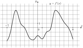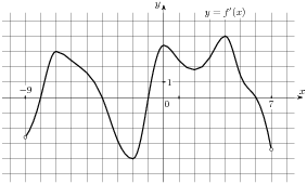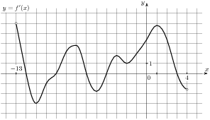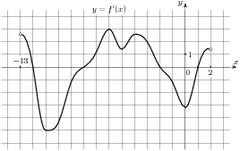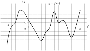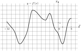 На рисунке изображен график производной функции f(x), определенной на интервале (−2; 12). Найдите промежутки убывания функции f(x). В ответе укажите длину наибольшего из них.