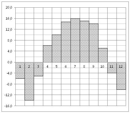 На диаграмме показана среднемесячная температура воздуха в Нижнем Новгороде (Горьком) за каждый месяц 1994 года. По горизонтали указываются месяцы, по вертикали - температура в градусах Цельсия. Определите по диаграмме наименьшую среднемесячную температуру в 1994 году. Ответ дайте в градусах Цельсия.