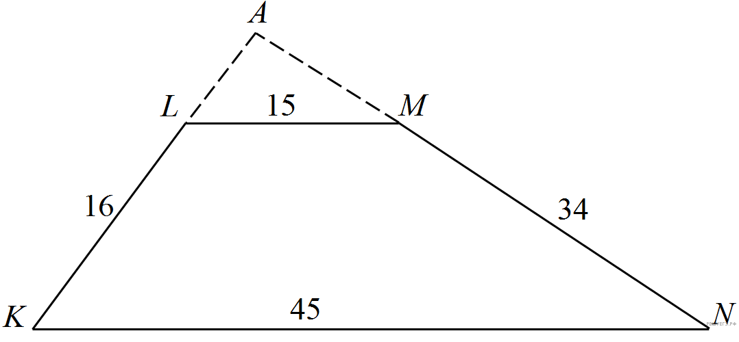 Боковые стороны KL и MN трапеции KLMN равны 16 и 34 соответственно. Отрезок, соединяющий середины диагоналей, равен 15, средняя линия трапеции равна 30. Прямые KL и MN пересекаются в точке А. Найдите радиус окружности, вписанной в треугольник ALM.