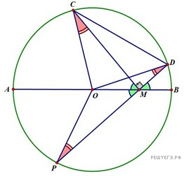 Точка M лежит на диа­мет­ре AB окруж­но­сти с цен­тром О. С и D  — точки окруж­но­сти, рас­по­ло­жен­ные по одну сто­ро­ну от AB, при­чем ∠CMA = ∠DMB.