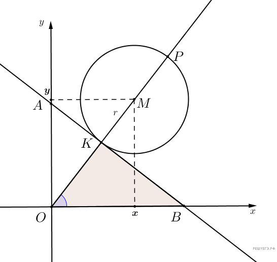 В си­сте­ме ко­ор­ди­нат за­да­на точка M (x; y), x > 0, y > 0. Дана окруж­ность с цен­тром в точке M ра­ди­у­са r, при­чем любая точка окруж­но­сти имеет по­ло­жи­тель­ные ко­ор­ди­на­ты. Пря­мая, про­хо­дя­щая через точку O (0; 0) и через точку M, пе­ре­се­ка­ет окруж­ность в точ­ках K и P, при­чем ор­ди­на­та точки K мень­ше, чем ор­ди­на­та точки P. Пря­мая, ко­то­рая ка­са­ет­ся окруж­но­сти в точке K, пе­ре­се­ка­ет пря­мые x = 0 и y = 0 в точ­ках A и B.