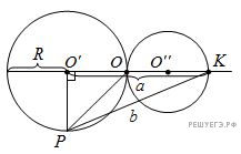 Две окруж­но­сти ка­са­ют­ся в точке O, при­чем ра­ди­ус окруж­но­сти с цен­тром в точке O' боль­ше, чем ра­ди­ус окруж­но­сти с цен­тром в точке O''. Пря­мая O'O'' пе­ре­се­ка­ет мень­шую окруж­ность в точке K (K от­лич­но от O). От­ре­зок O'K = a. Пря­мая t ка­са­ет­ся боль­шей окруж­но­сти в точке P так, что угол O''O'P  — пря­мой. От­ре­зок PK = b. Най­ди­те пло­щадь тре­уголь­ни­ка OO'P.