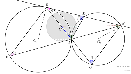 Две окружности касаются друг друга внешним образом в точке A. Прямая, проходящая через точку A, пересекает первую окружность в точке B, а вторую — в точке C. Касательная к первой окружности, проходящая через точку B, пересекает вторую окружность в точках D и E (D лежит между B и E). Известно, что AB = 5, AC = 4. Точка O — центр окружности, касающейся отрезка AD и продолжений отрезков ED и EA за точки D и A соответственно.
